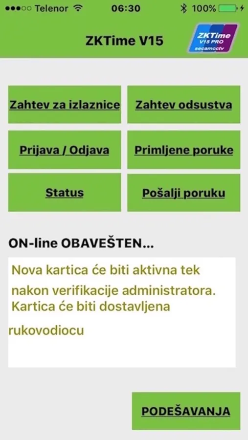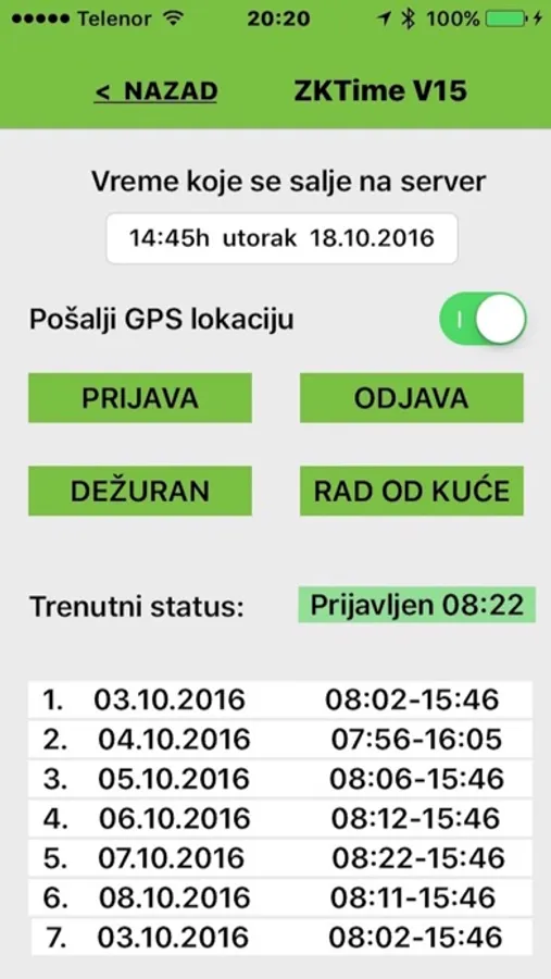 ZKTime V15 je aplikacija za evidenciju radnog vremena, namenjena korisnicima koji vec imaju instaliranu serversku stranu sistema ZKTime V15 ili ZKTime V16 ili koriste ZKTime V15 CLOUD. Aplikacija komuniciraju sa serverom putem interneta( 3G/LTE/Edge/WiFi).