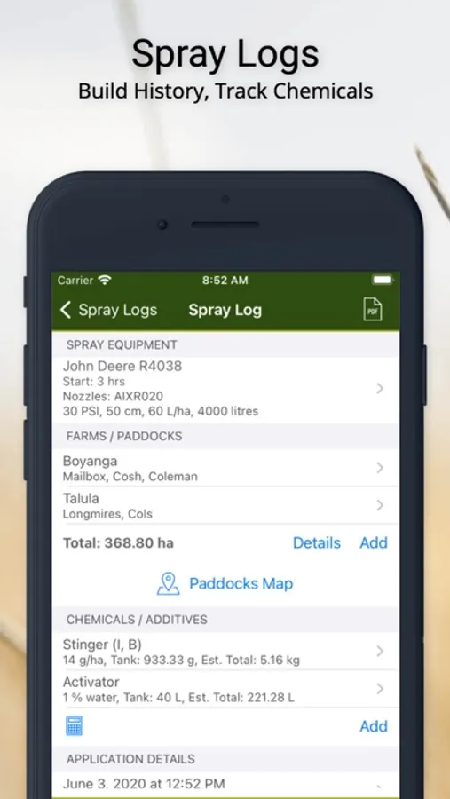 • Spray Logs - Record all relevant details for spraying. Includes a load calculator and remote lookup of weather stations.