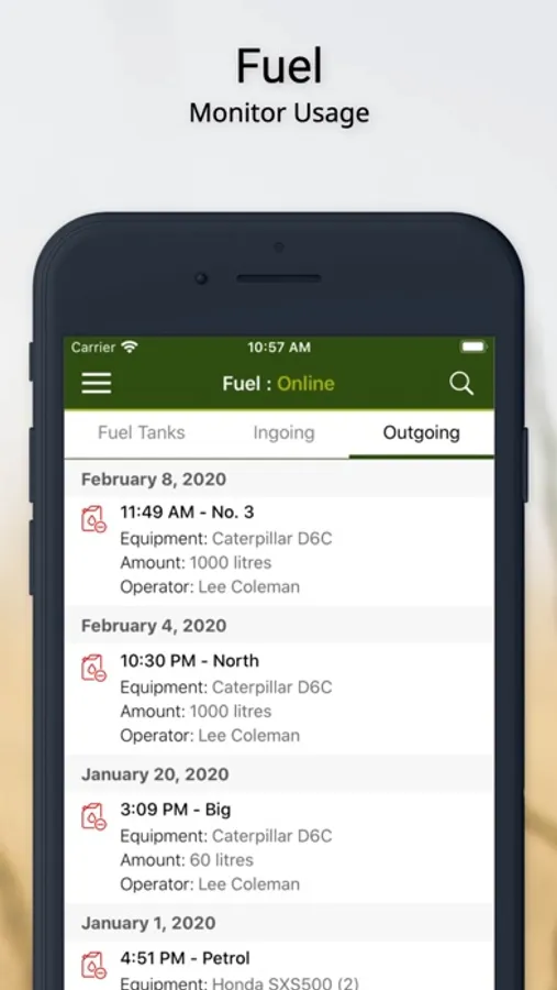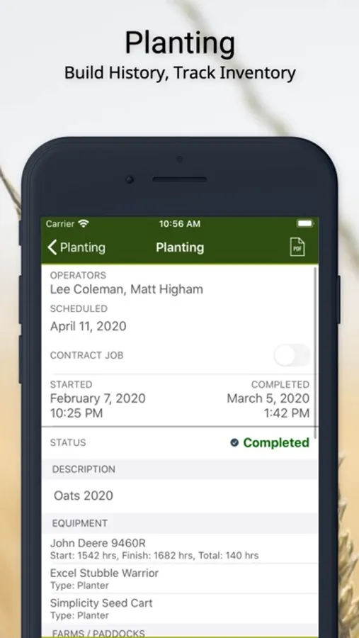 • Inventory Management - Track ingoing and outgoing Grain, Fuel, Chemicals, Fertilisers and Water. Enter grain contract details to track fulfilment. Assign fuel to an activity.