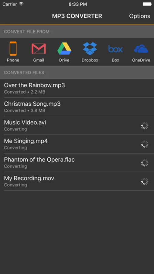 Convert your music and videos to MP3, and MP3 files to various formats, right on your iPhone or iPad. Conversions are very fast and quality is preserved. You can convert files from your phone, or files from your favorite cloud services directly within our app. Files are being converted by our powerful servers, and after conversion is done, result is downloaded to your device and files are being deleted from our servers. This also means the app won't burden your processor or RAM, nor it will drain your battery.