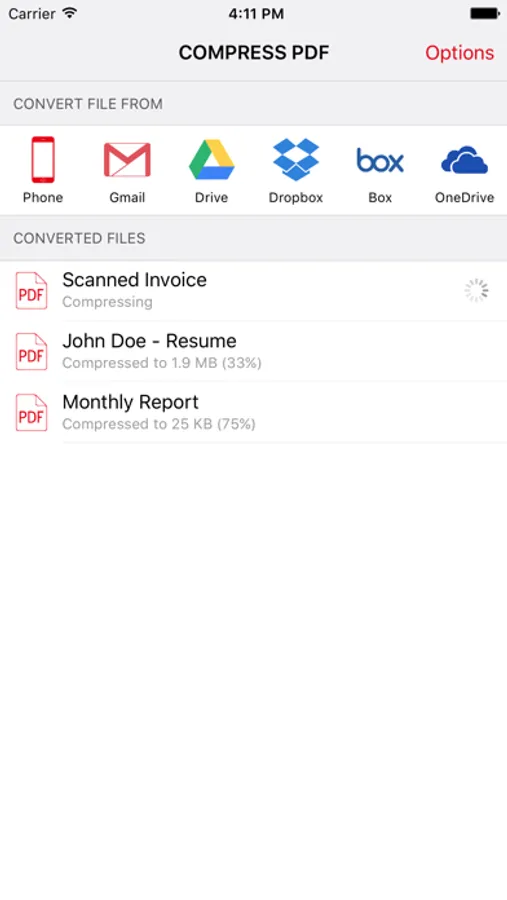 Make your PDF documents smaller right on your iPhone or iPad with this fast and easy to use app. Just select PDF document from your phone, or from Gmail, Google Drive, Dropbox, Box, and OneDrive, and it will be compressed in just a couple of seconds on average. Depending on your document, it can be compressed significantly or just a little bit. Quality of your document is preserved. Compressions are performed on our powerful servers, so the app won't drain your battery or burden your phone's processor or RAM. After compression is done, the result is downloaded into the app, and your files are deleted from our servers.