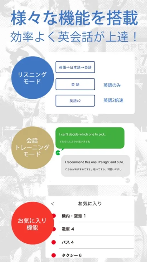 AppStore旅行部門で第1位を獲得!大手メディアASCII.JPが紹介。フレーズ数が、これまでの約2倍のボリュームになって再リリース!約2400フレーズ紹介。これだけのフレーズ数で全フレーズに英語-日本語-英語の聞き流し機能を搭載しているのは現在このアプリだけ。今回、新たにNHKのラジオ講座「基礎英語1」、スピードラーニング、TOEIC教材などのナレーションを多数担当しているピーター氏を起用。また一度ダウンロードするだけで、オフラインでも場所を気にせず、いつでも好きな時に学習できる。短期間で本物の基礎英会話を身に付けたい人にオススメ。