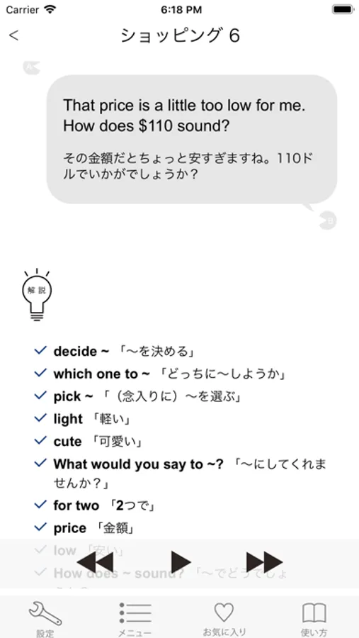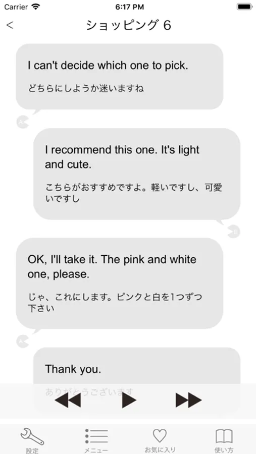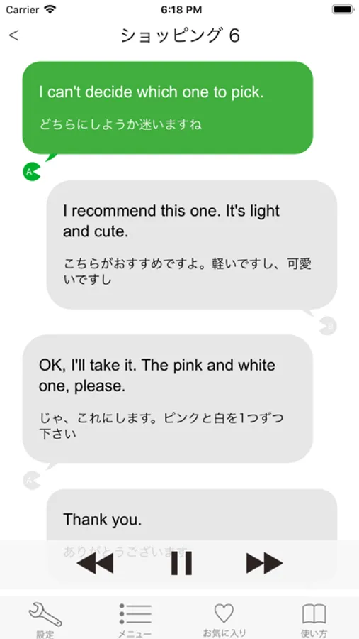 「英語-日本語-英語モード」に設定で、車や電車などでの移動中、散歩やランニング中、家事の合間などのすきま時間に簡単にトレーニングができます。英語が2回流れるので、2回目の英語の際に一緒に声を出すか、頭の中で確認すると効果的です。苦手なフレーズは、「お気に入り」に登録。また、1つの会話を長めに収録しているので、会話を膨らませる能力が上達します。