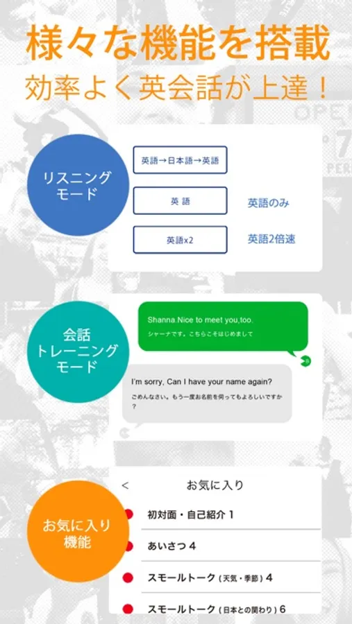 「英語-日本語-英語モード」に設定で、車や電車などでの移動中、散歩やランニング中、家事の合間などのすきま時間に簡単にトレーニングができます。英語が2回流れるので、2回目の英語の際に一緒に声を出すか、頭の中で確認すると効果的です。苦手なフレーズは、「お気に入り」に登録。また、1つの会話を長めに収録しているので、会話を膨らませる能力が上達します。