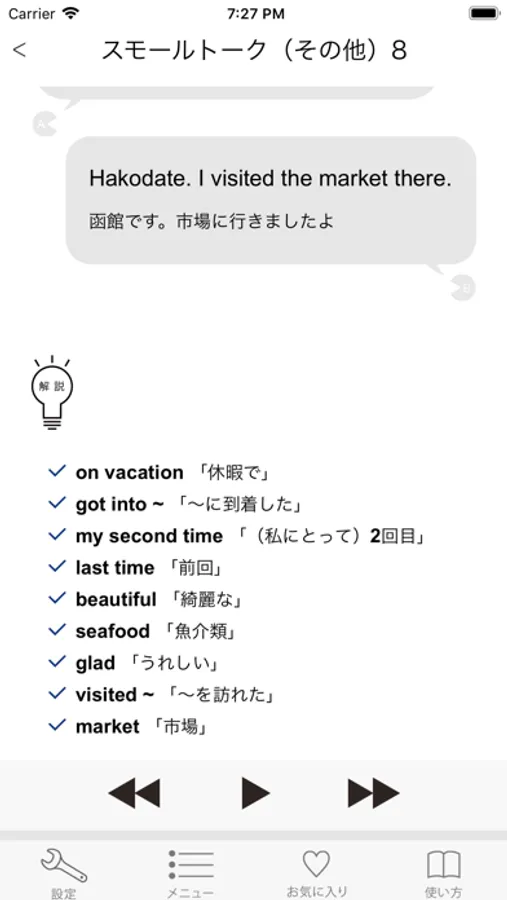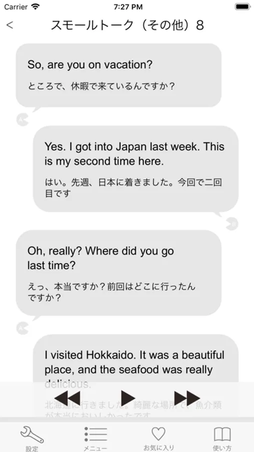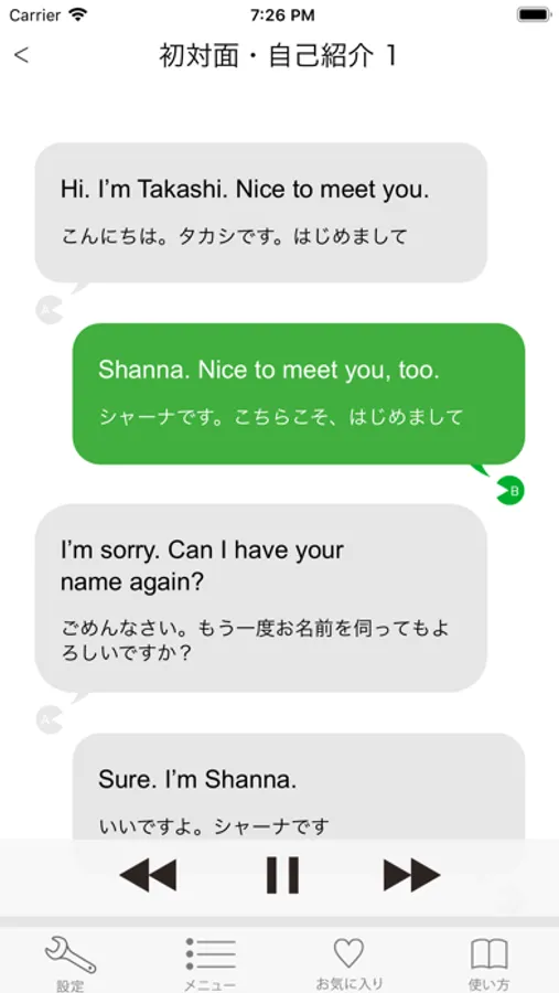 「会話トレーニングモード」を使えば、Aパートを話すとBパートは自動的に応答、Bパートを話すとAパートは自動的に応答するようになっています。つまり、会話のシュミレーションをトレーニングすることができます。「会話トレーニングモード」を使わず、アプリの音声と一緒に声を出すだけでも練習になります。声に出すことがスピーキング上達の近道なので、ぜひ試してみてください!