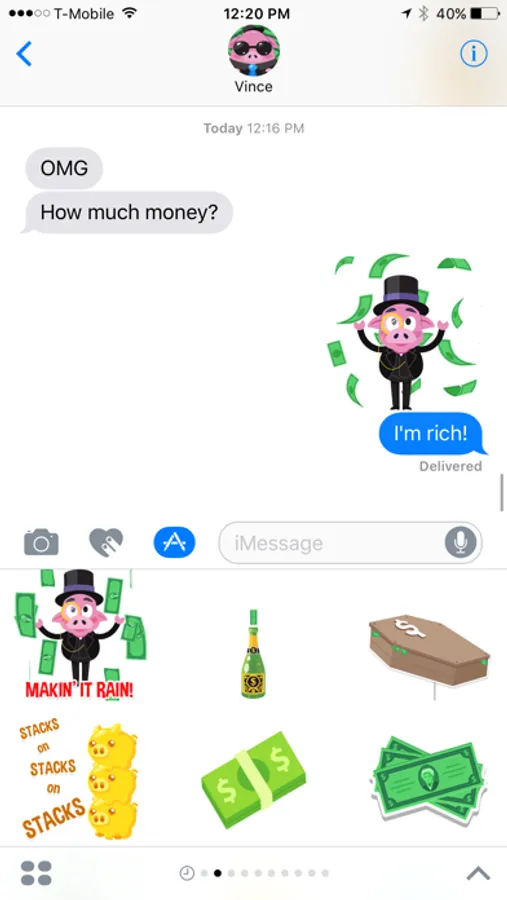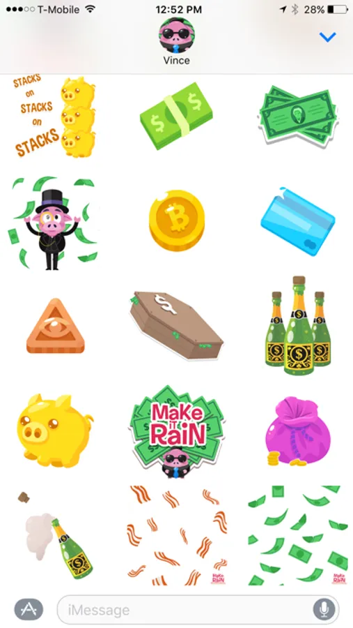 Money falling from the sky? Check. Champagne bottles popping? Got that. Bills, more bills, gems and cash money? Yup. Make your iMessages rich with dynamic and animated stickers from the game Make It Rain!