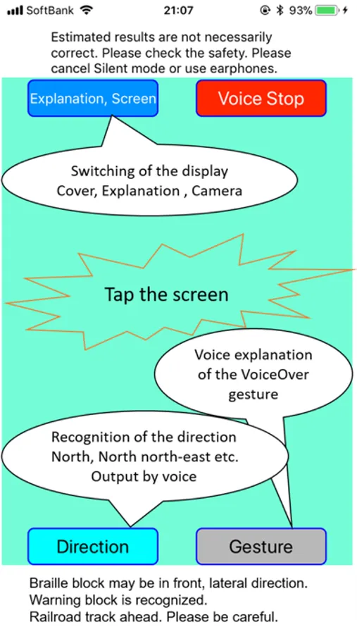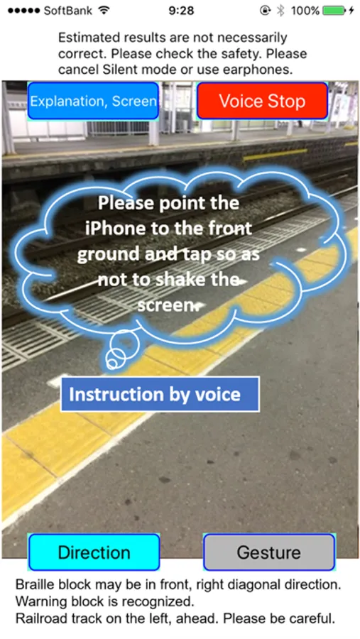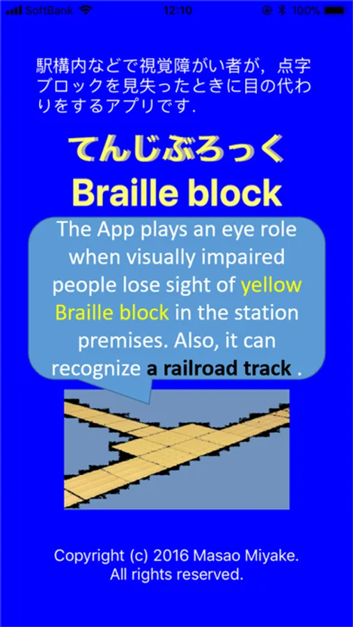 Even with yellow Braille block, the App can not recognize it if it’s tint is different. Also, since outdoor Braille block is often unrecognizable due to dirt and aging, please use the App mainly in buildings such as a railroad station. Since there are also misrecognition and undetected due to the lighting environment and similar color objects. Please use it for reference only. Please use the cane to check the safety.