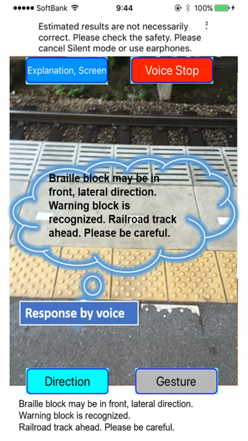 As another function, the App recognizes a railroad track on a station platform and notifies the approximate position. Also, you can check the direction you are facing. All of these recognition results are transmitted by voice.