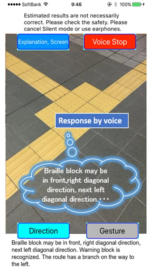 When a visually impaired person is lost sight of yellow Braille block (formal name "Visually Impaired Guidance Block") at a station or a public facility, its existence and the approximate direction is estimated by the App, and also Warning block (dotted sureface block) is detected. Furthermore, the App judges the route of Braille block and informs how to proceed.