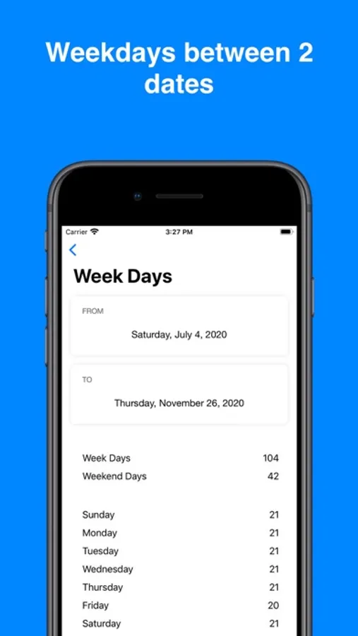 Find how many days are there for your holiday trip or find weekdays and weekends between two dates.