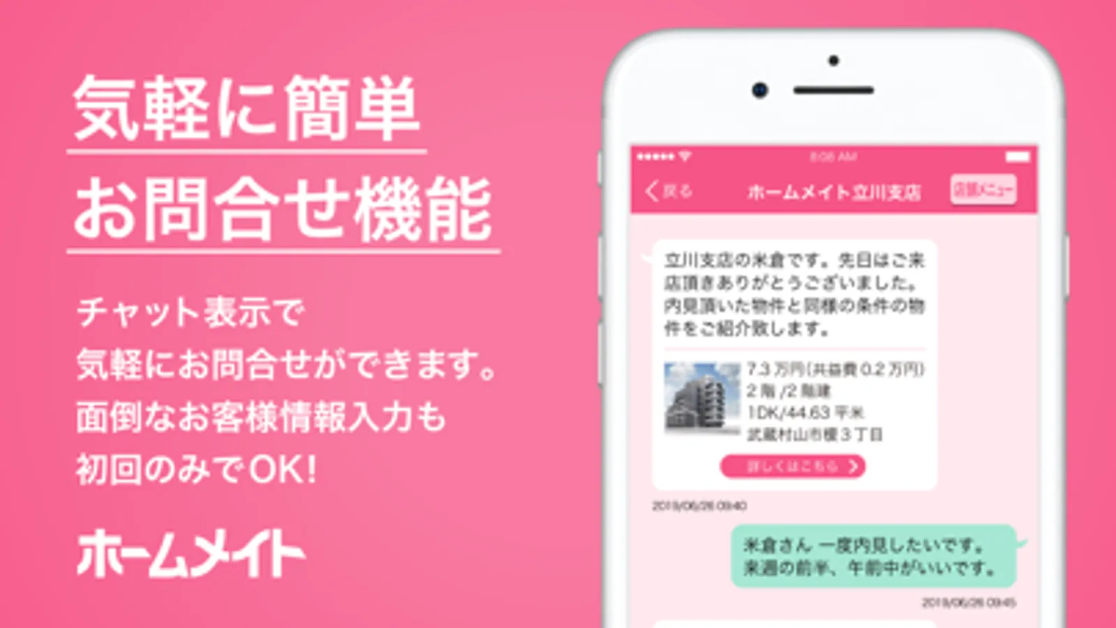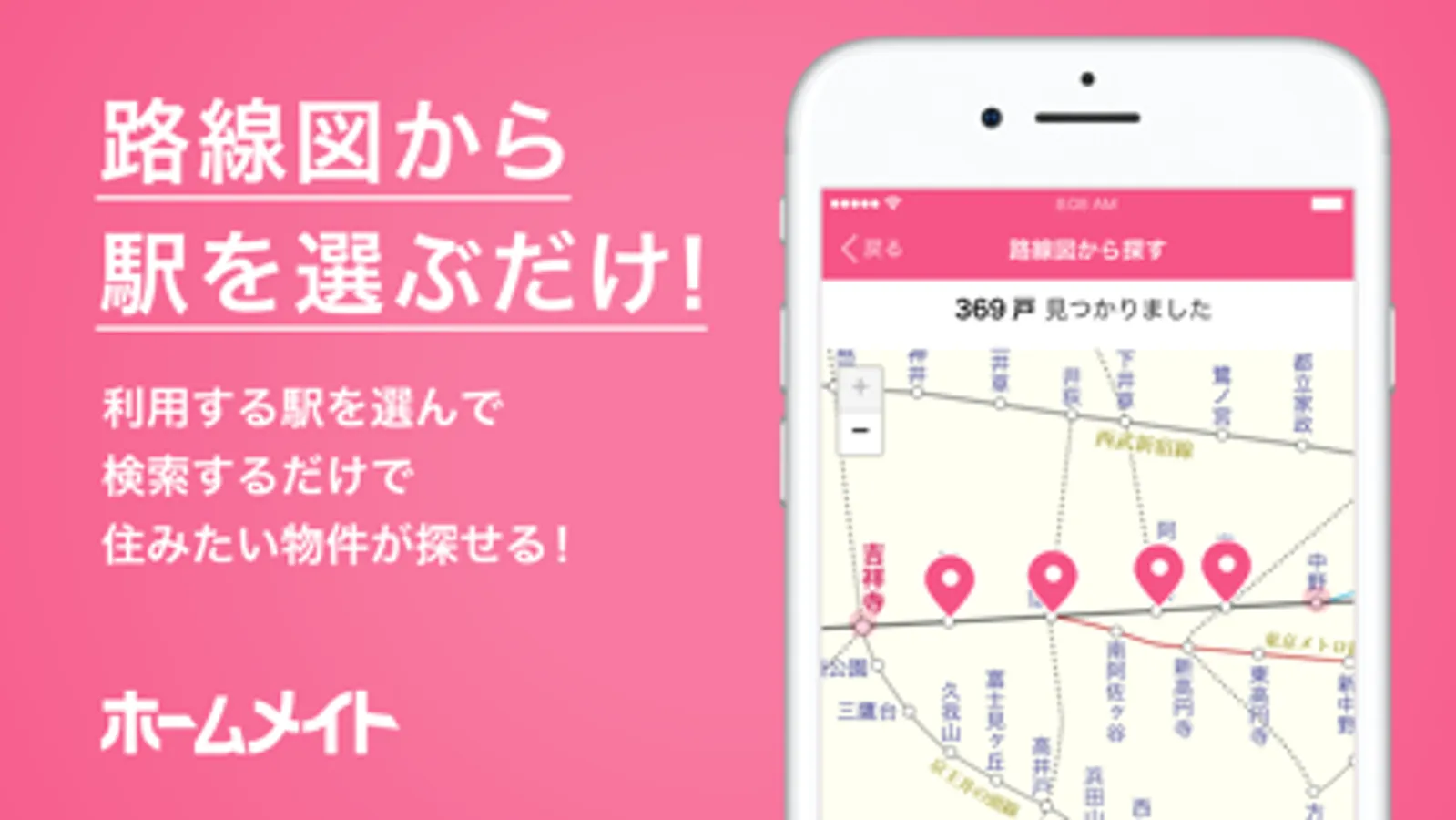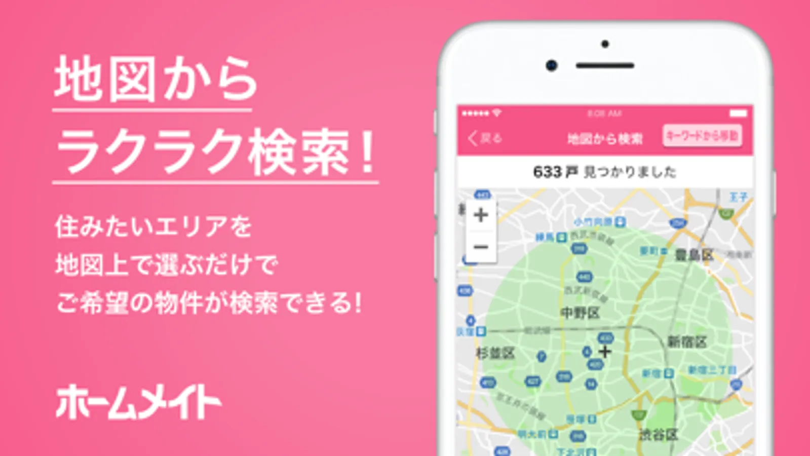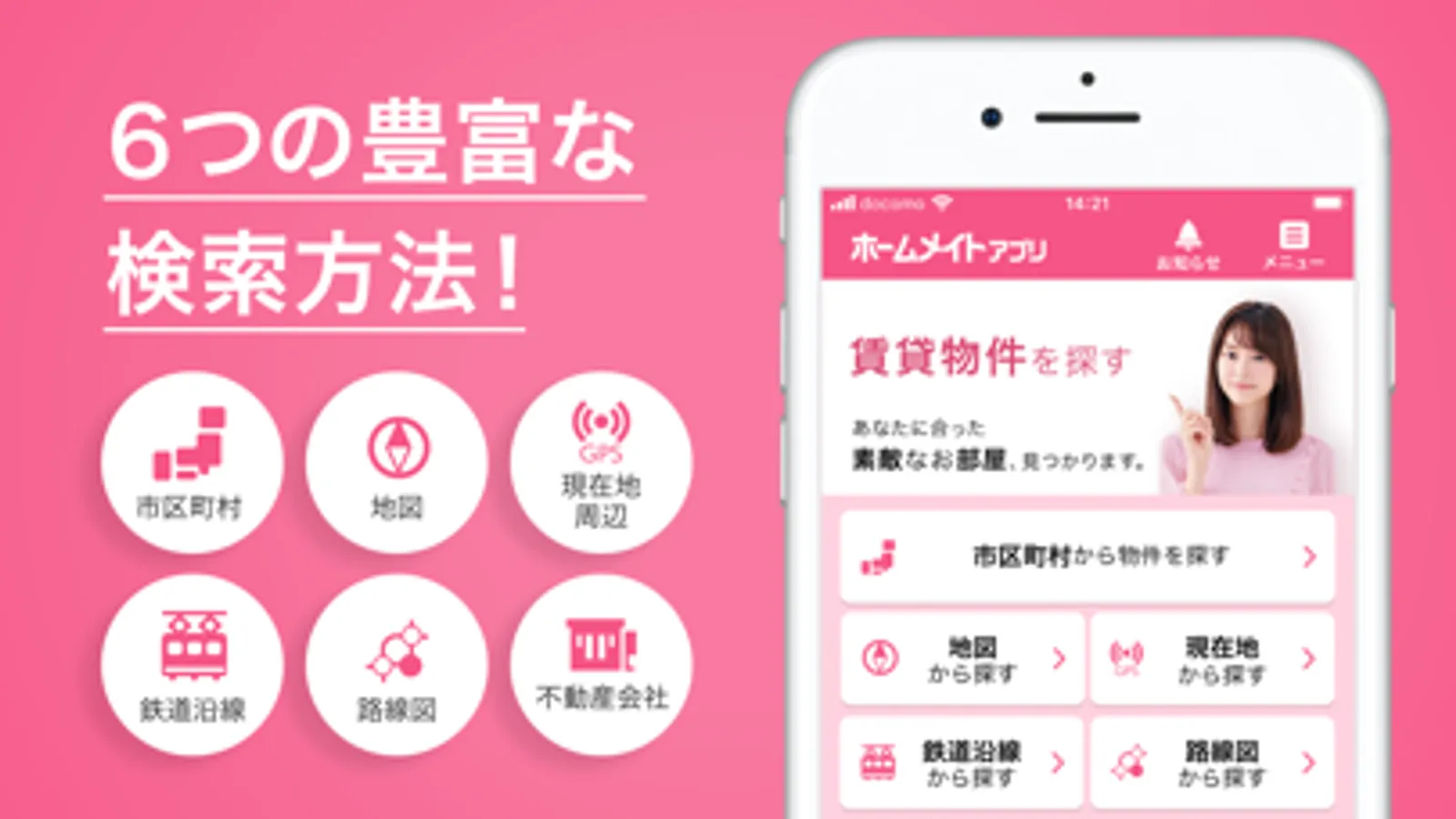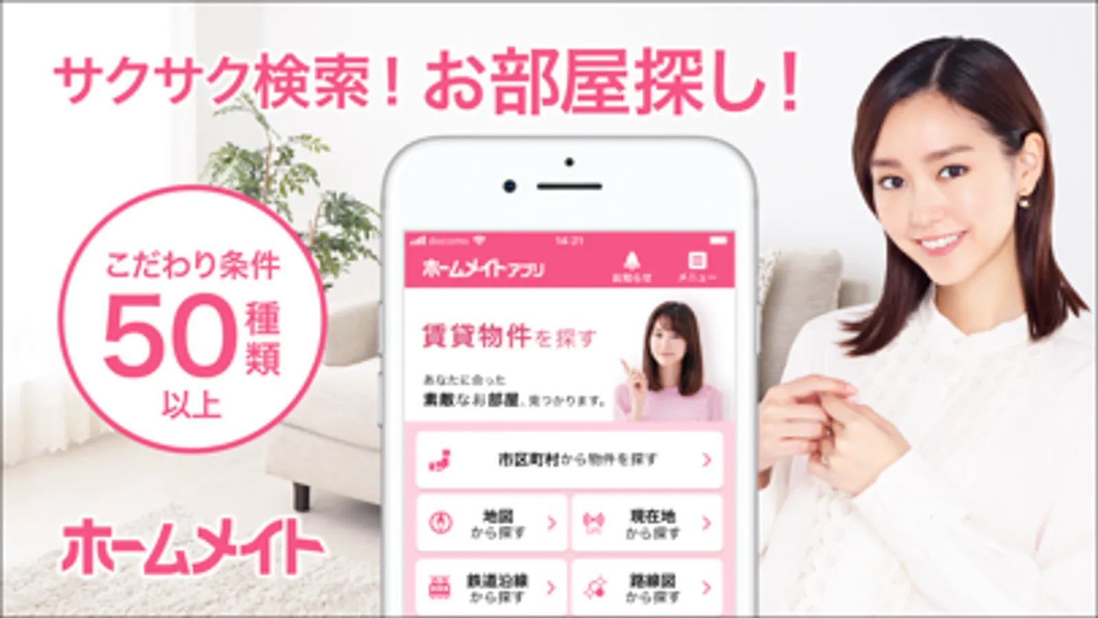 アパート・賃貸マンション、一軒家やメゾネットなど、幅広い物件を豊富な機能で検索できるホームメイトアプリ。