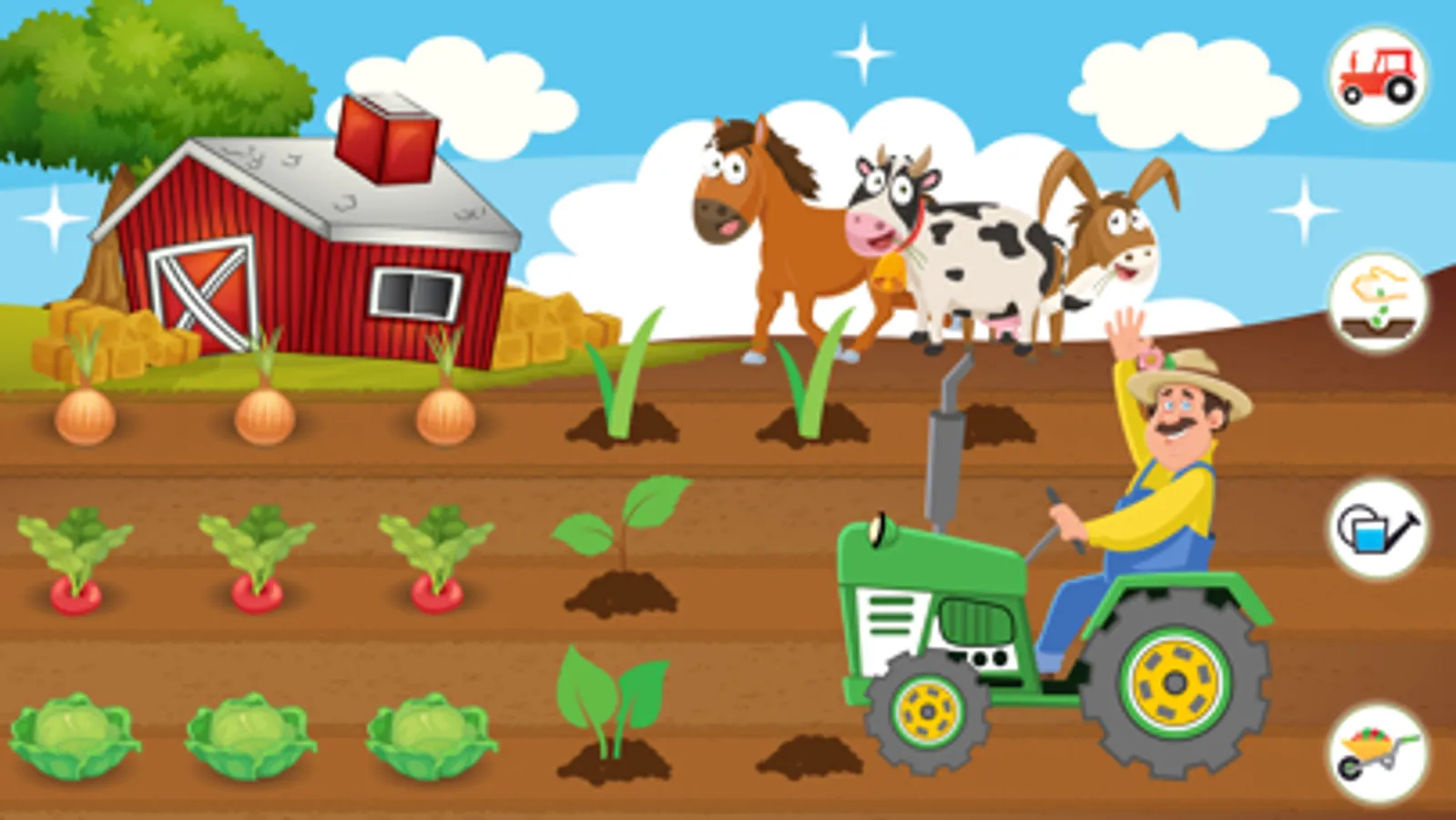 - Farmer activity: planting different kinds of vegetables, watering the vegetables and