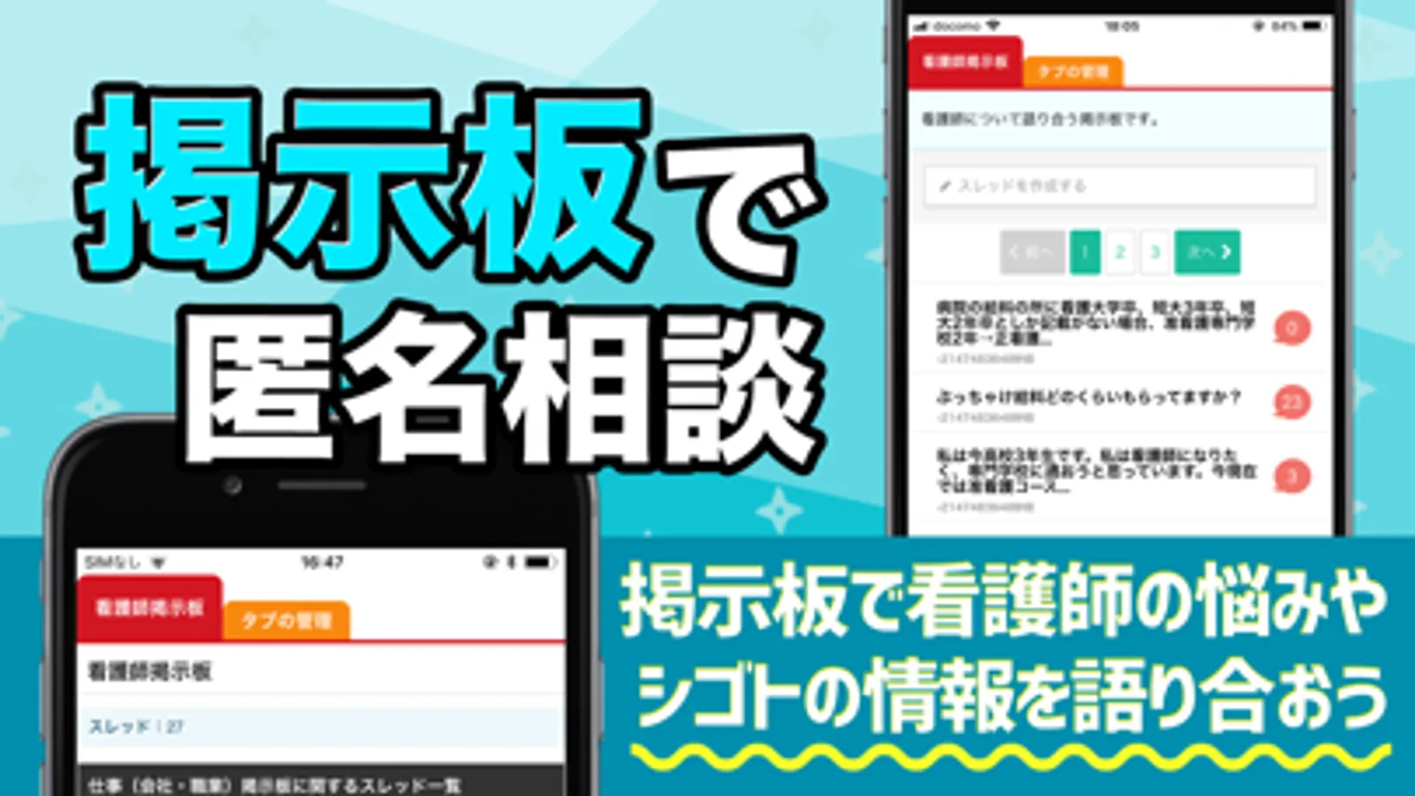 また、看護師にまつわる掲示板機能を搭載しています。