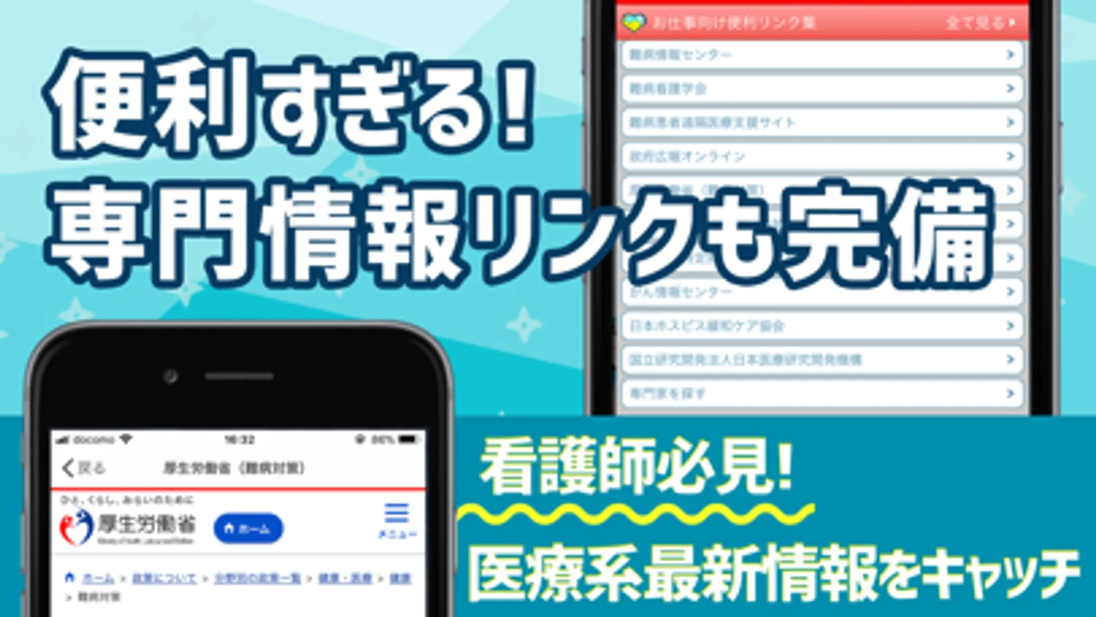 最新のニュース情報から役立つ医療・福祉ニュース・看護師の転職に役立つニュースなどをまとめて配信しています。記事はタブを自由に選択並び替えができるので、見たい情報にすぐアクセスでき情報収集を効率化ができるアプリならではの機能も搭載しています。