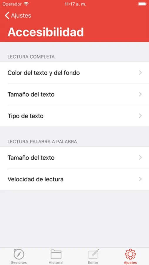 - Lectura completa: Se puede configurar el color del fondo y del texto para mejorar el contraste y seleccionar el tamaño y el tipo de fuente para mejorar la legibilidad. - Lectura palabra a palabra: El contenido irá apareciendo palabra a palabra, pudiéndose configurar, además de los parámetros de la visualización estándar, la velocidad de aparición de las mismas.