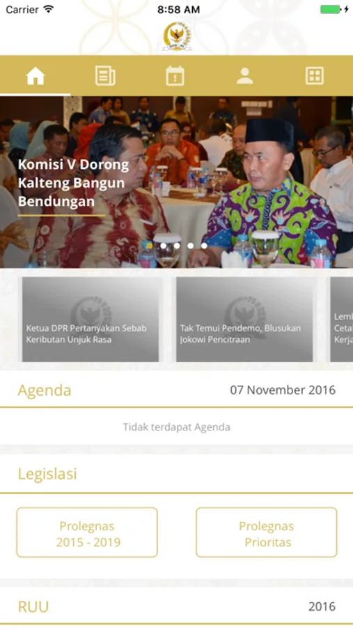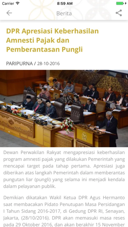 Aplikasi ini menyajikan berita terkini dari DPR RI, jadwal kegiatan DPR RI, Rancangan Undang - Undang, Undang - Undang, sampaikan aspirasi serta menyampaikan pengaduan online...