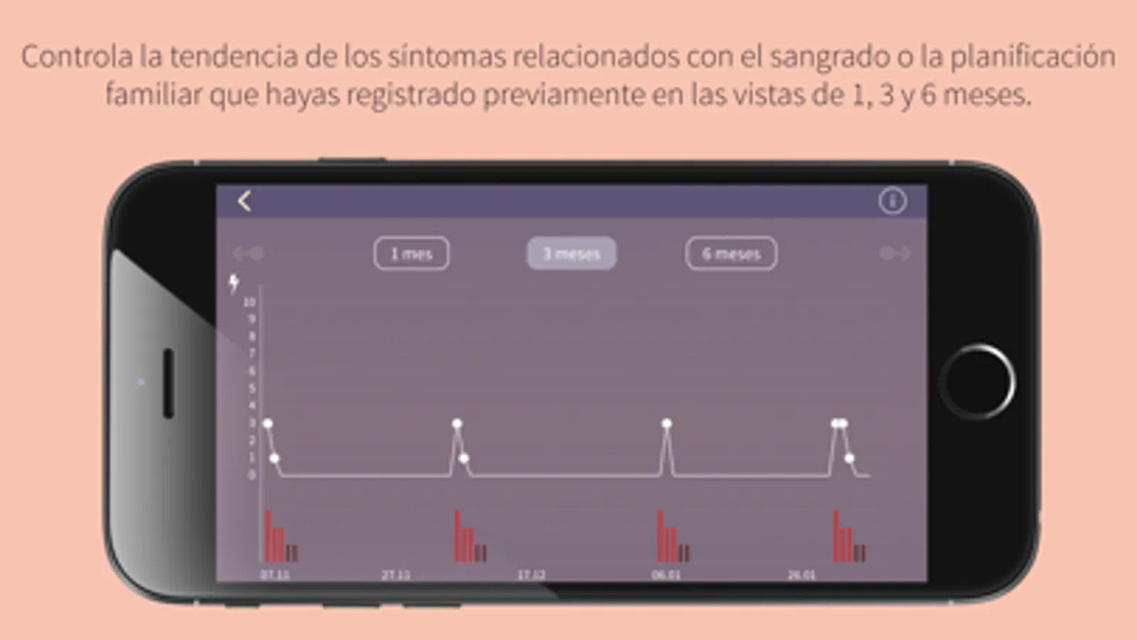 - Vistas diaria, mensual y lista, y vistas gráficas (1, 3 o 6 meses) para monitorizar el sangrado o la planificación familiar