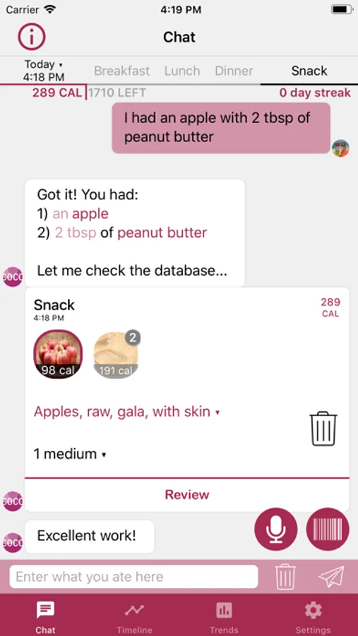 Log your food quickly and easily with Coco, the conversational calorie counter that uses cutting-edge AI technology developed at MIT. Simply tell Coco what you ate, and she will automatically log the nutrition facts! Every time you use Coco, you help us with our research and make Coco smarter :)