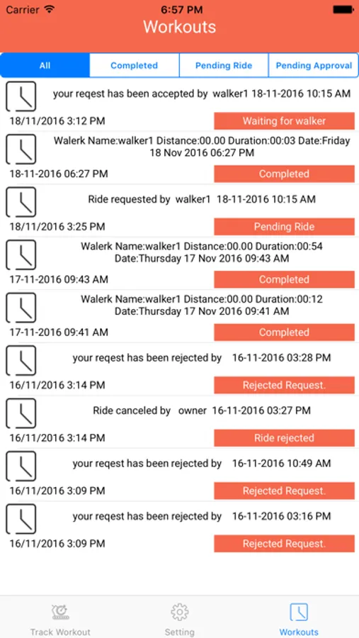 Owner and Walker, both can see their completed and pending Dog walking ride's history in workout section.