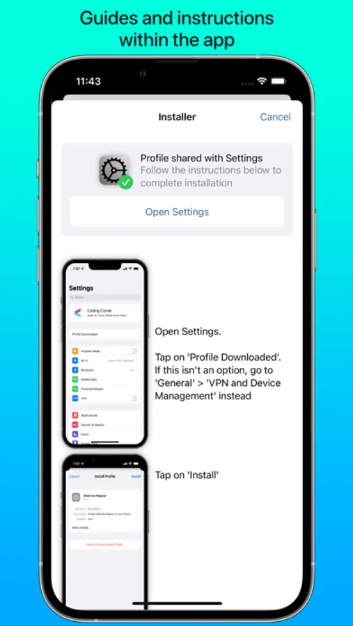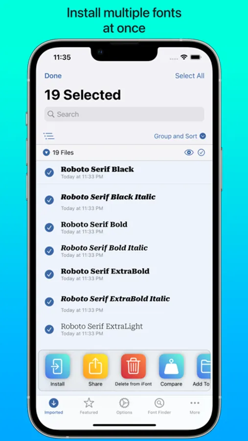 Install your own fonts (.ttf, .ttc, .otf formats supported, as well as these formats compressed in a .zip) for use in other apps. Simply download a font in a web browser, open in iFont and follow the simple instructions to install it on your device. You can also export a copy of the font, or send the profile to a friend to let them install it, too. iFont can also open archives containing multiple fonts.