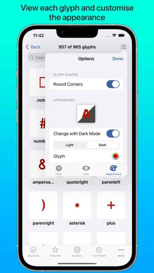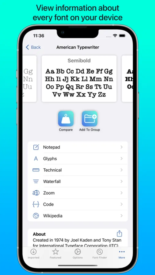 iFont includes a wide range of features which let you install, compare, and view typefaces, including individual glyphs and technical details. These include: