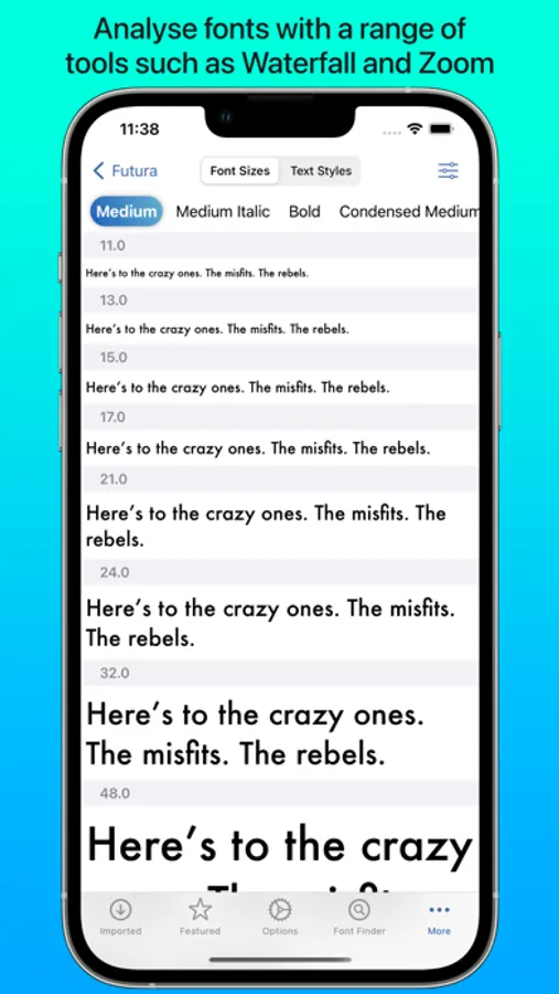 See how a font looks at very small or very large point sizes easily using the Waterfall view. This lets you judge which size would be suitable for your use.