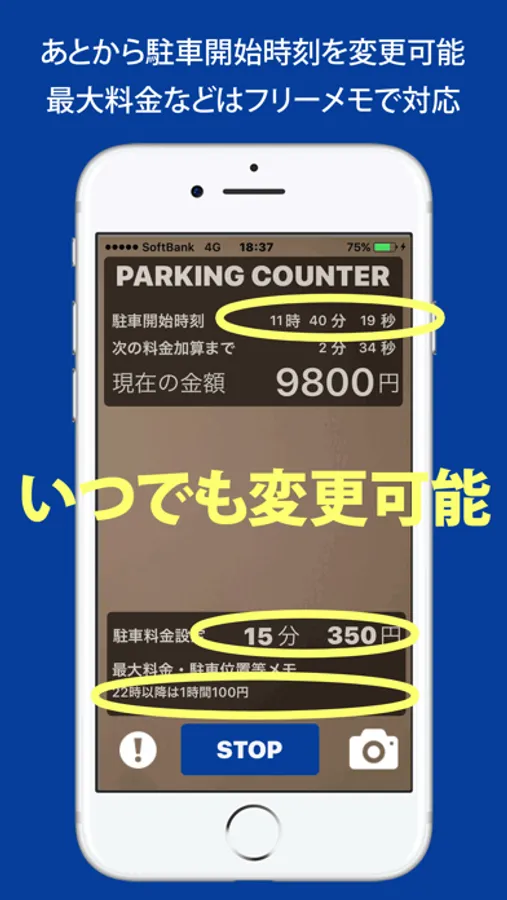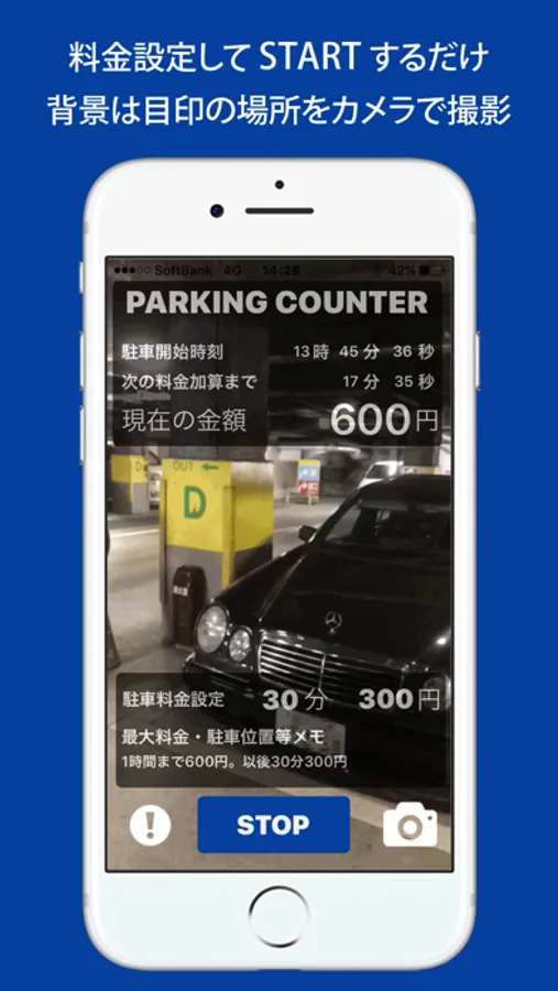 ・駐車時に「START」することで、現在料金がいくらで、次何分何秒で課金されるかがひと目でわかる