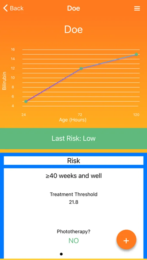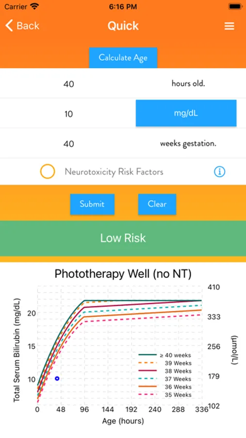 This app calculates an infant's threshold for beginning phototherapy from his or her age, bilirubin level, and risk using the American Academy of Pediatrics 2022 “Clinical Practice Guideline Revision: Management of Hyperbilirubinemia in the Newborn Infant 35 or More Weeks of Gestation”. The results are displayed on the Phototherapy Threshold and Exchange Therapy nomograms.