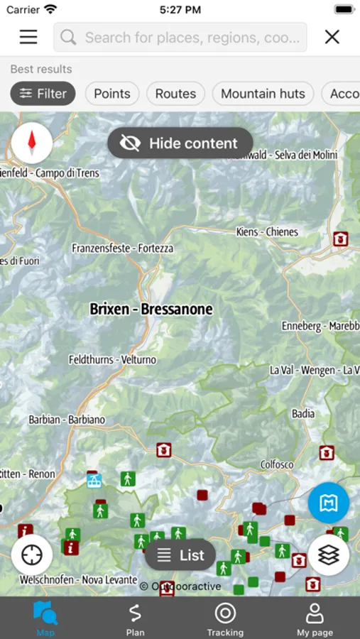 Search by place or activate your location to discover nearby activities. Filter results based on your interests and explore the map to find new ones. Put the results in list form to immediately see a brief description.