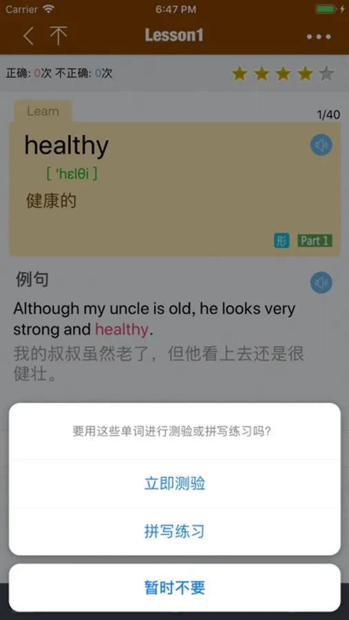 学完每课后,你可以通过测试检验自己的学习成果,对于难记的单词可以反复学习。