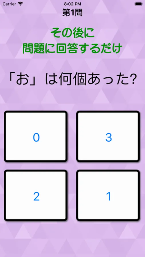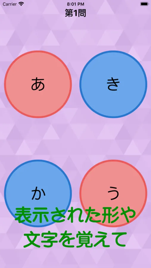 ・画面に表示される形や文字を数秒で記憶し、その記憶が残っているかを確かめていきます。