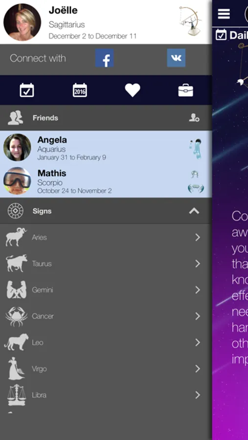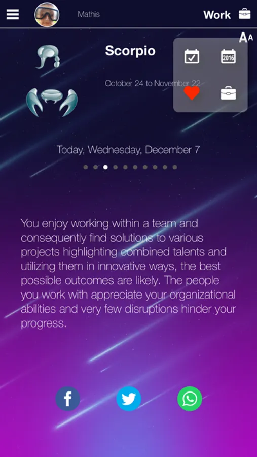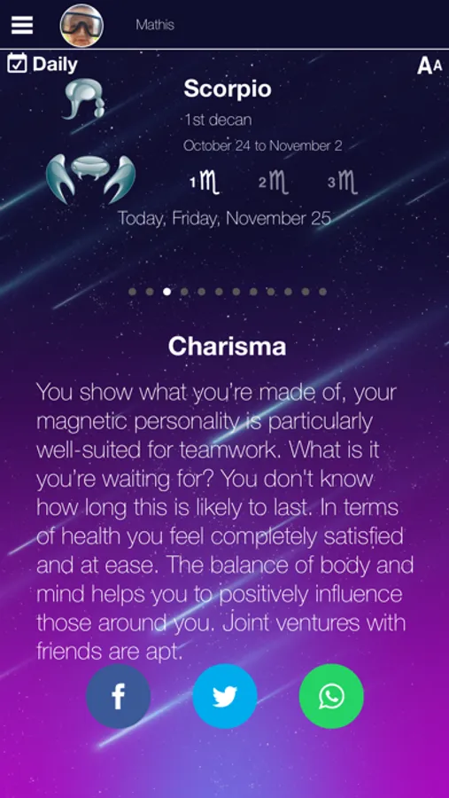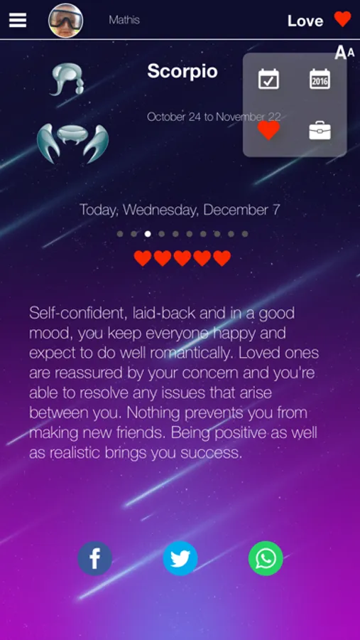 Share with your friends, through Social Network (Whatsapp, Facebook, Twitter, VK, Google+, etc.) your horoscope for any day. They also may be happy to discover this amazing app.