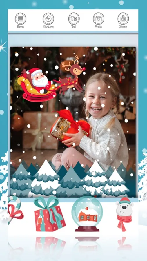 Enjoy your holiday season with our amazing Christmas photo frames collection. In our application, discover the most beautiful Christmas and New Year images such as Christmas balls, baubles, stars, tree lights, snowflakes, reindeer, snowman, Santa Claus, Christmas Angel and many more. You can also add text, Merry Xmas wishes or Happy New Year messages on your images.