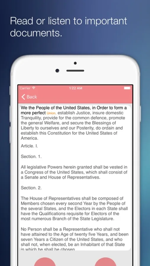 The Our Presidents app has a tab called "Documents", that lets you listen or read The Bill of Rights, The Constitution or The Declaration of Independence.