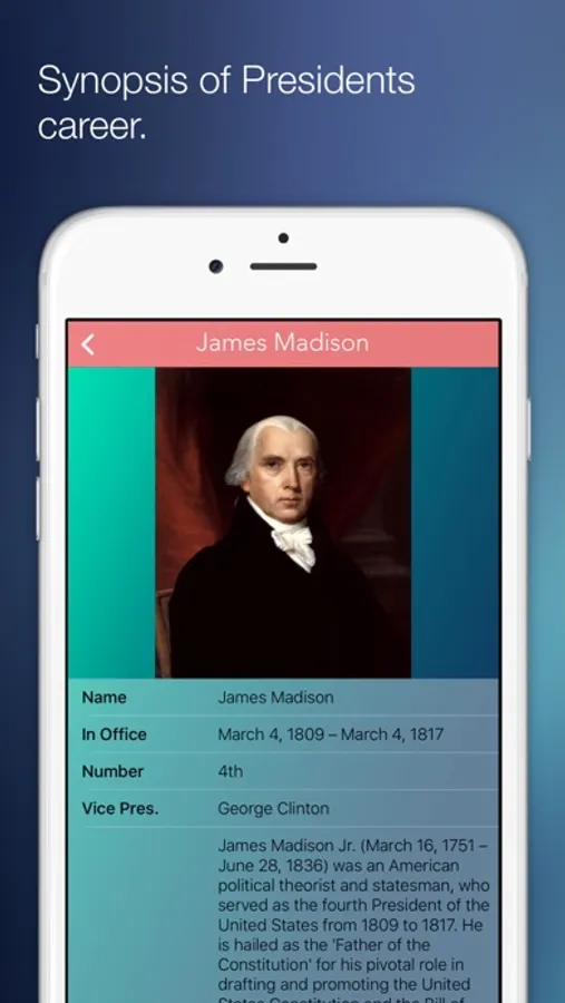 Have you ever wanted to learn all of the United States Presidents? The Our Presidents app contains all 45 Presidents of the United States in chronological order. The app also features the presidents time in office and the Vice President at a glance. The Our Presidents app is quick and simple. With a tap of the screen, learn all about said President with a synopsis of important facts.