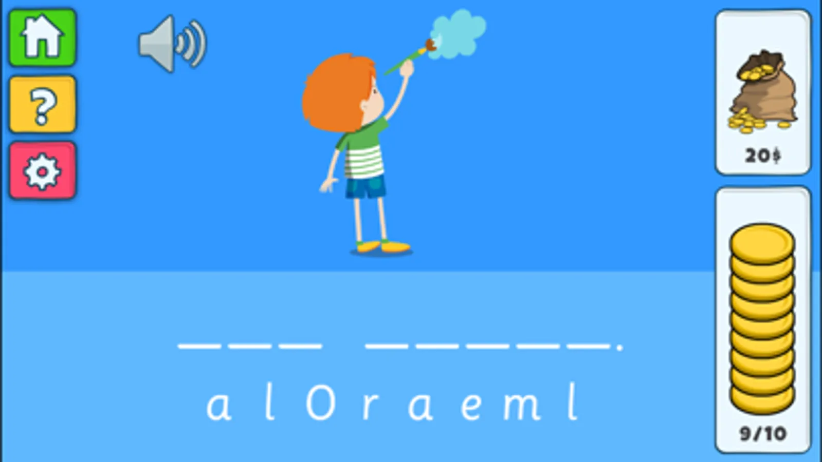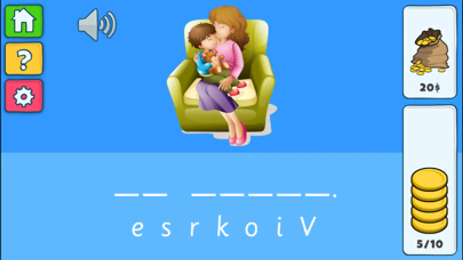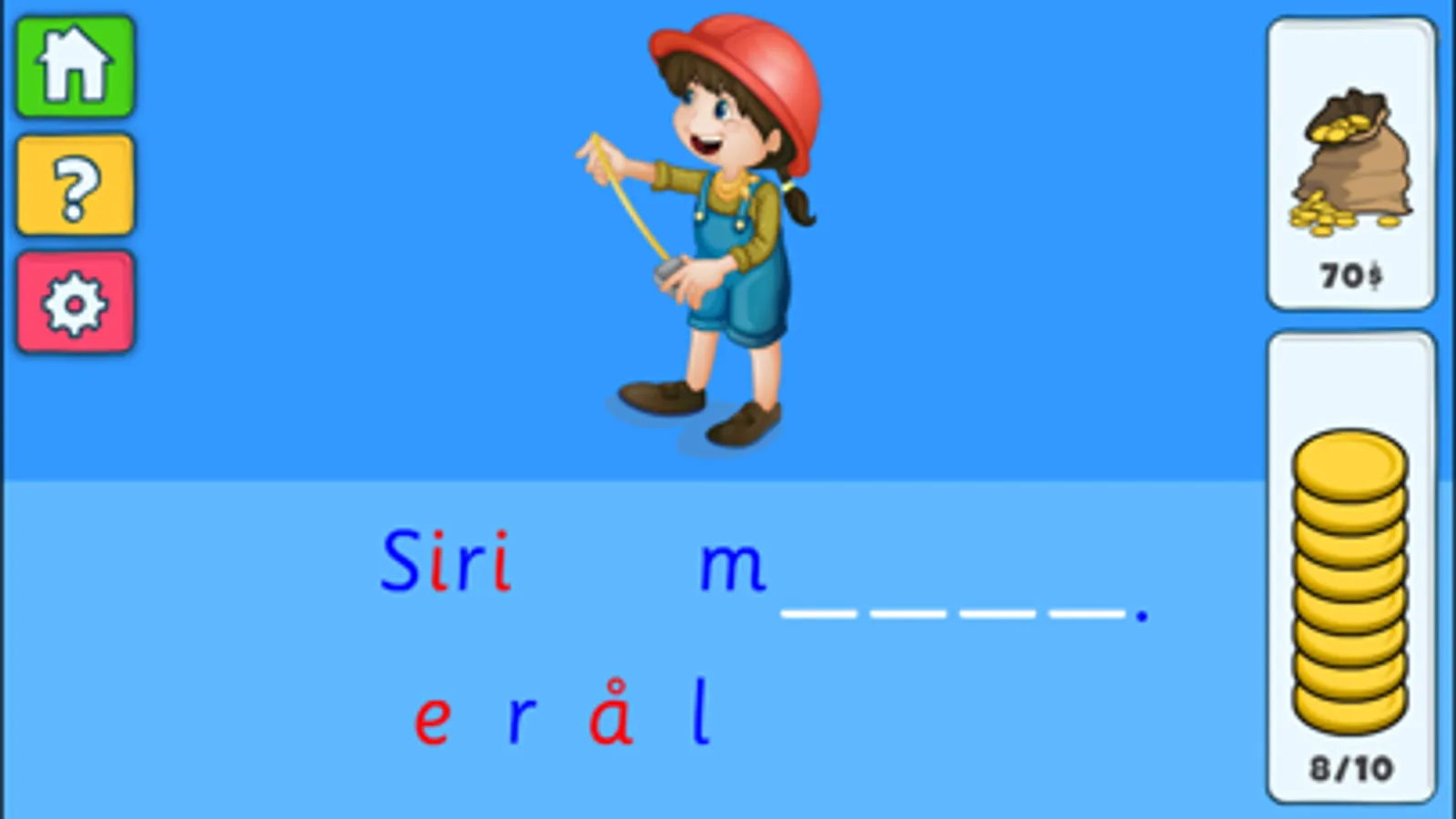 Ved å trykke på figuren, får man høre setningen som skal staves. Man kan også høre bokstavlydene ved å trykke på hver enkel bokstav. Dra så bokstavene i riktig rekkefølge til de tomme linjene under figuren for å stave setningen.