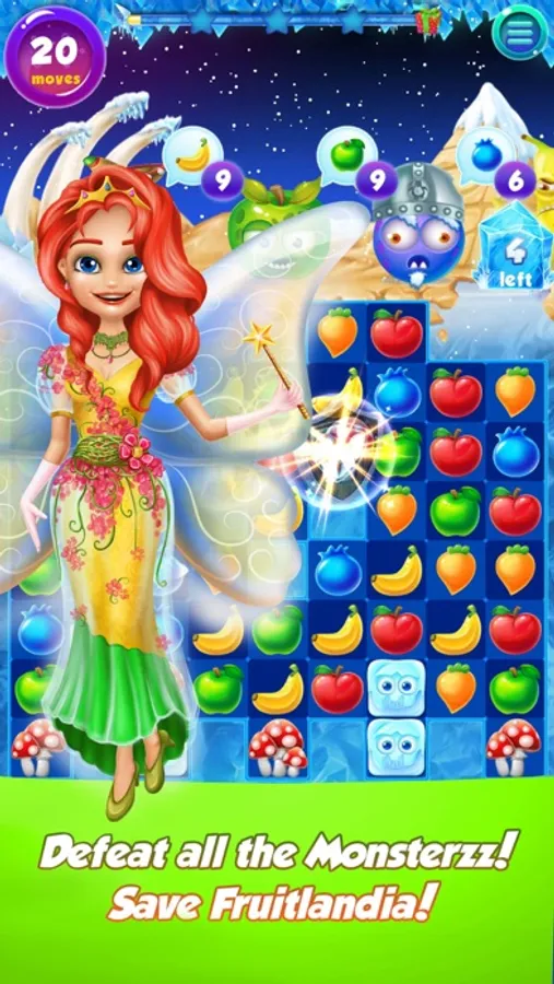 So, let’s check out a supervised story and amazing trip through Fruitlandia. All of the game events are taking you to spectacular world of Fruitlandia which in that moment are in danger because of attacks from angry Peng-Vuu with his army of the same monsters. In the match 3 games such as Juice Fruits you will have to rescue not only this wonderland but your friends – little magic fairies which were imprisoned by angry monsters. But don’t think that each monster in match 3 games will be caught so easily and you can defeat one of them without preparation. So, you’ve got to look forward to face with numerous entertaining levels, beautiful locations and wide range of improving values which you can use during gameplay. To pass one or another level in puzzle games you’ve to collect the necessary combination – in our case it’s a fruit combo – a certain amount of which can help to defeat monster which is submitted at this level. To become stronger you are able to upgrade your helpers-fairies to get higher damage to your opponents it this match 3 game.