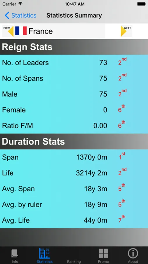 * Be able to rank stats for rulers/reigns and countries.