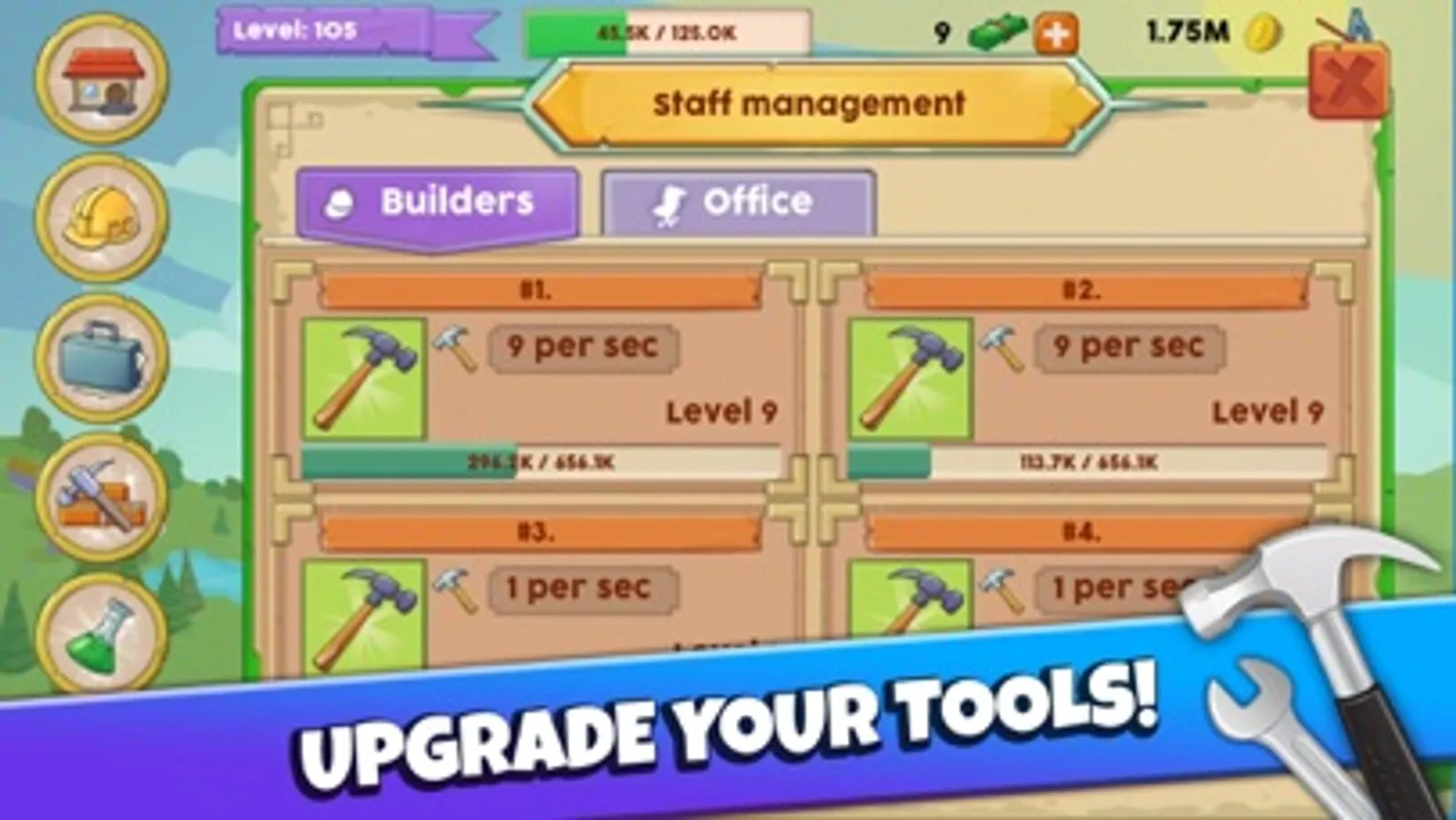 Build family houses, earn money, upgrade structures, hire more construction workers to help, and even create ANOTHER city in this combination clicker and city building game! Earn achievements and rewards as you create a blooming business; build the tallest highrise, boost your economy and MORE!