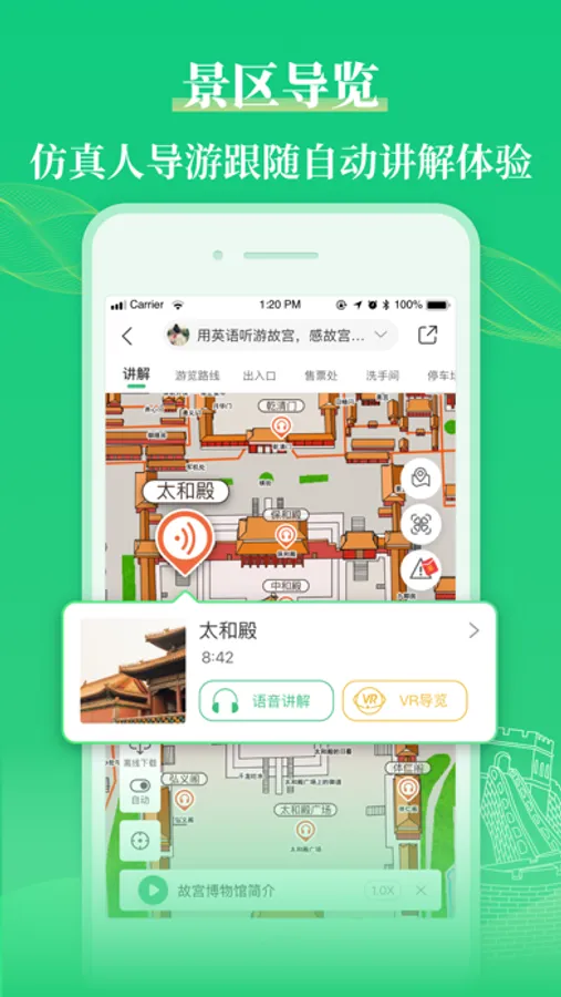 语音导览可以帮助用户在参观特定的旅游景点时获得智能景点的游玩指引,切换至后台时,仍会继续播报。景区嘈杂博物馆内也需要安静,建议带上耳机使用,收听效果最佳。GPS在后台持续使用将会影响电池续航时间