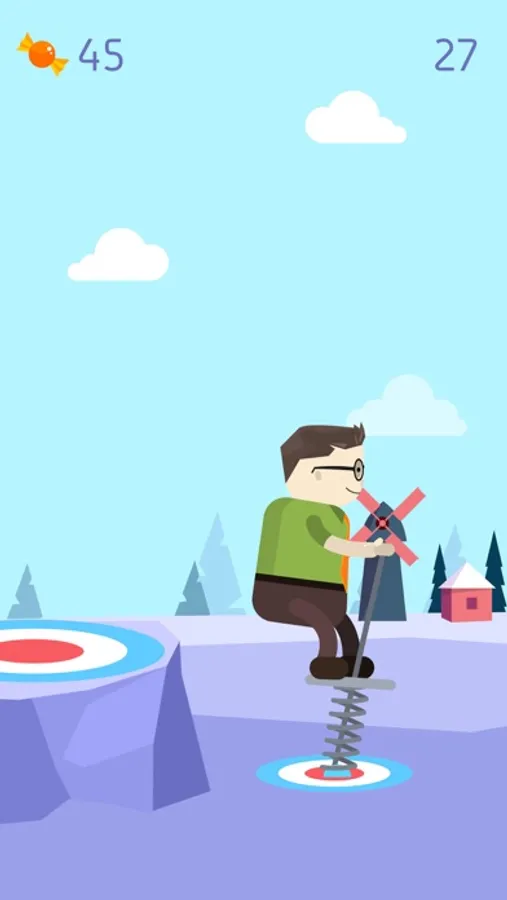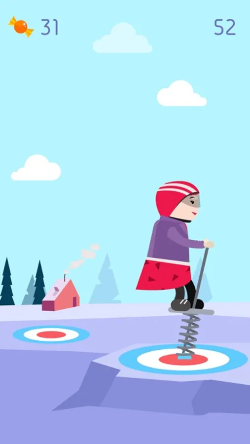 Tap and hold the screen to start jumping toward the next marked circle with your Pogo stick, release at the right time to land on right ground. By jumping from one circle to another circle you collect points. Moreover, if you can give a bull’s eye shot by landing exactly on the red big dot inside the circles, you will get one extra point for each perfect shots.