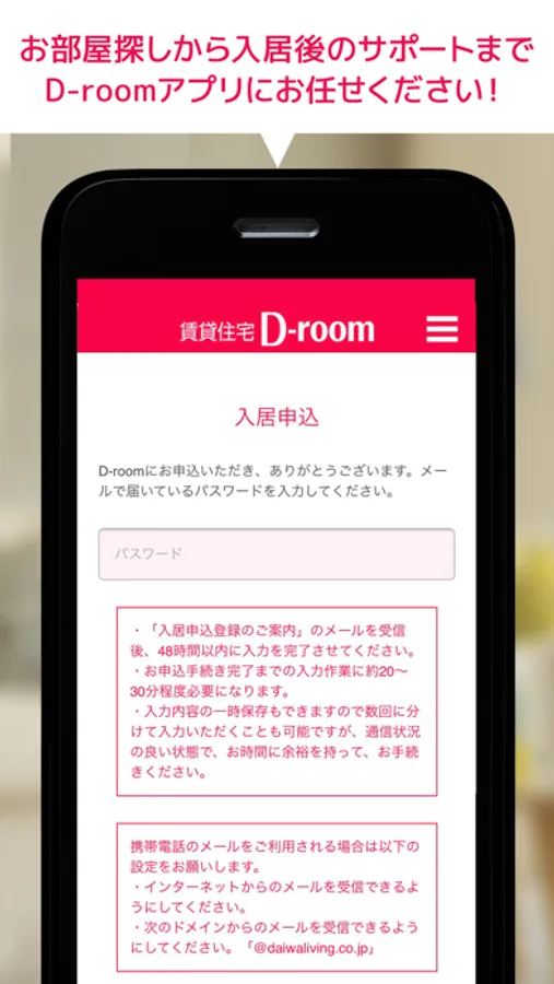 ・各種変更手続き、退去のお申込み申請はmy D-roomで。24時間いつでも空いている時間に簡単手続きで便利です。