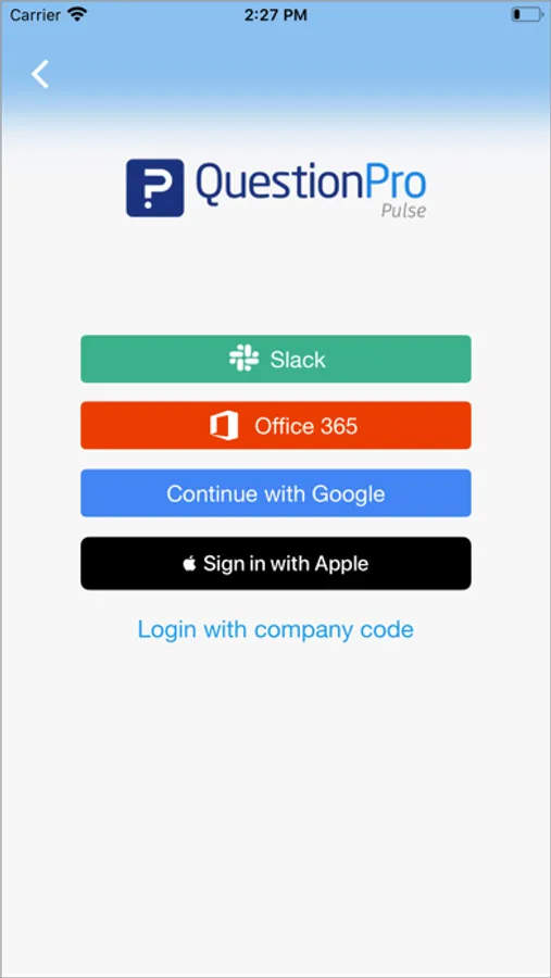 Using the QuestionPro Pulse application you can integrate with Slack, Google Plus or Office 365 and easily log into the app using any one of the integration. You can also enter the email address, password registered with QuestionPro and enter the access code which can be added from the Workforce account.