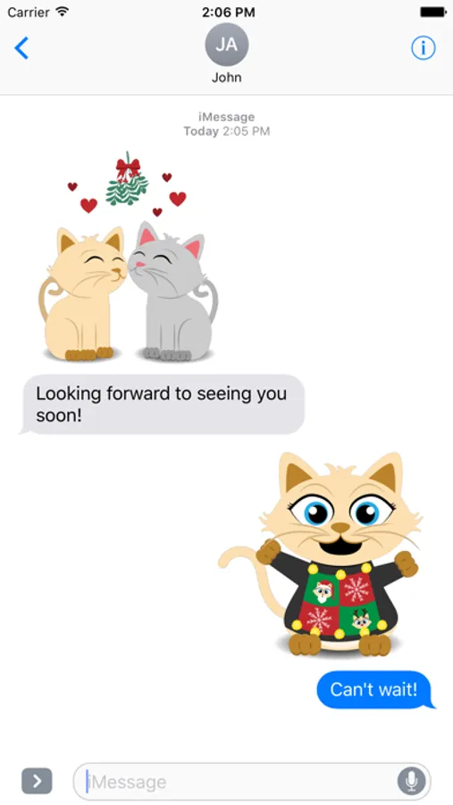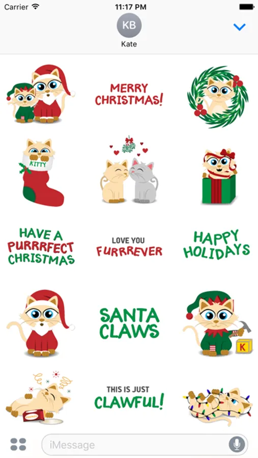 These fun-loving kitties will help you celebrate any kind of Christmas -- whether you like to spend yours caroling, wearing ugly Christmas sweaters, catching snowflakes on your tongue, or just waiting for Santa, these friendly felines will help you celebrate all season long. With 27 ANIMATED kitties in Christmas poses and 21 text stickers, you're ready for some serious Christmas cheer.