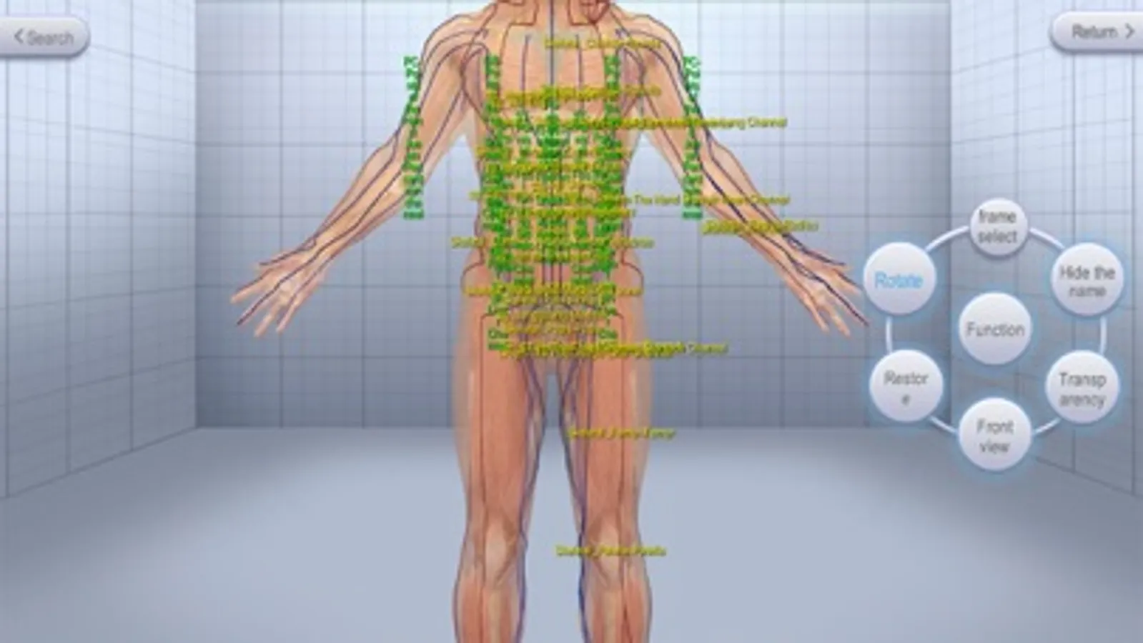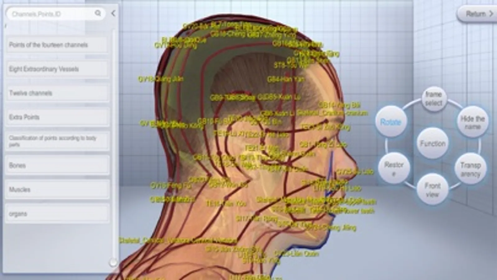 The basic version of the software with the aid of advanced 3D technology, built in 3D digital "Chinese bronze" as the carrier of traditional Chinese medicine meridian interactive display system, achieve the functions of channels, points, bones, muscles, organs display query, interactive control and the basic functions and assisted learning function of practice test, points test. Covers human anatomy, channels, points of knowledge. The integration of important knowledge, using 3D human body model reflects human anatomy (bones, muscles, organs) and indications of 12 channels, 8 extra-channel and 800 points. The software is provided with the functions of transparency, select, rotate, move, restore, hide or display name, arbitrarily choose a fixed area to view the region's channels and points, through the transparency adjustment can be more clearly seen in the human body structure, the flow of channels , the specific location of points.