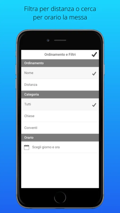MessApp è l'app per trovare la messa più vicina all'orario preferito: la ricerca seleziona le chiese in cui c'è una messa nell'arco di un'ora rispetto all'orario ed al giorno indicati nel filtro: ad esempio, se si cerca una messa alle 9 di domenica, verrano trovate le chiese in cui ci sono messe la domenica dalle 8:30 alle 9:30.