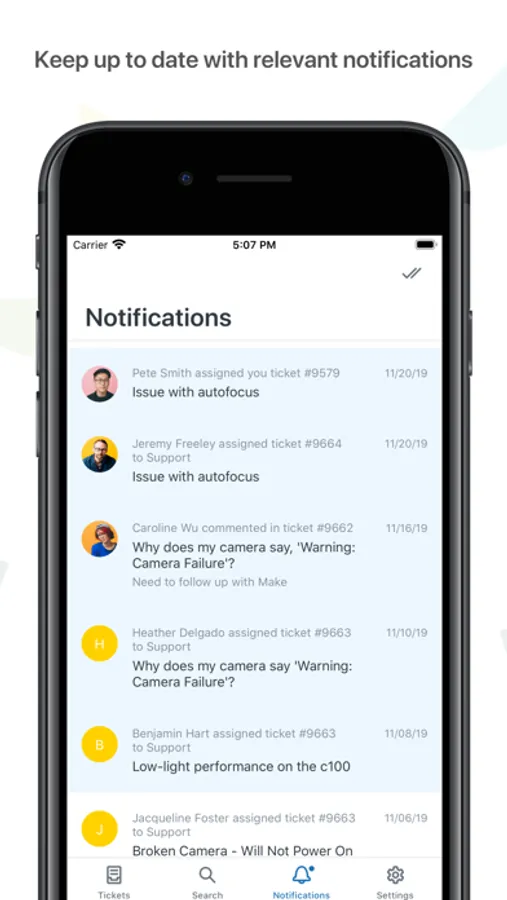 Real-time push notifications on critical customer updates, a list of activity on your tickets in the notification feed. Configure which notifications you receive by group and when you want them, by day and time.