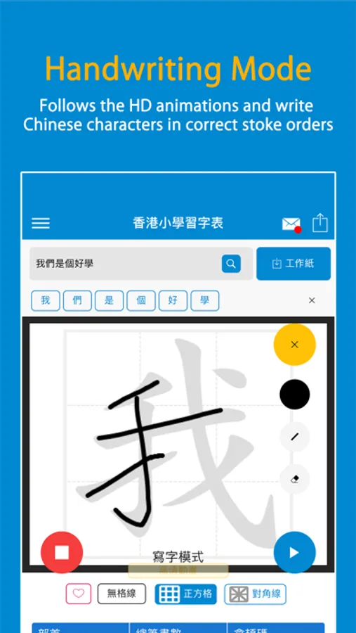 This app is follows the guidelines of “Lexical List for Chinese Learning in Hong Kong” of the Hong Kong Education Bureau. It helps primary level students to learn Chinese writing and stroke orders effectively. This app is an effective Chinese learning companion tool.