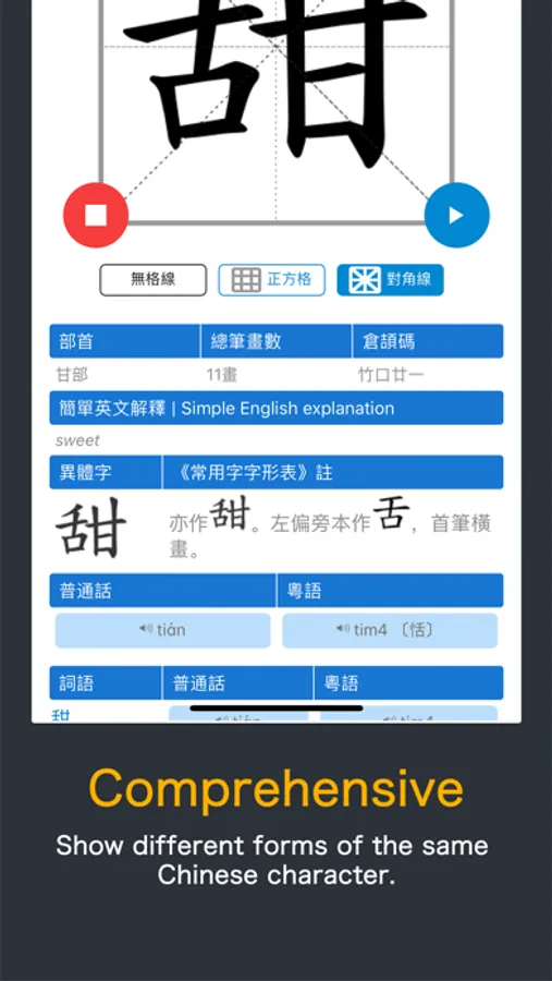 * Audio Pronunciation: Instantly hear native-speaker audio in Cantonese and Mandarin.