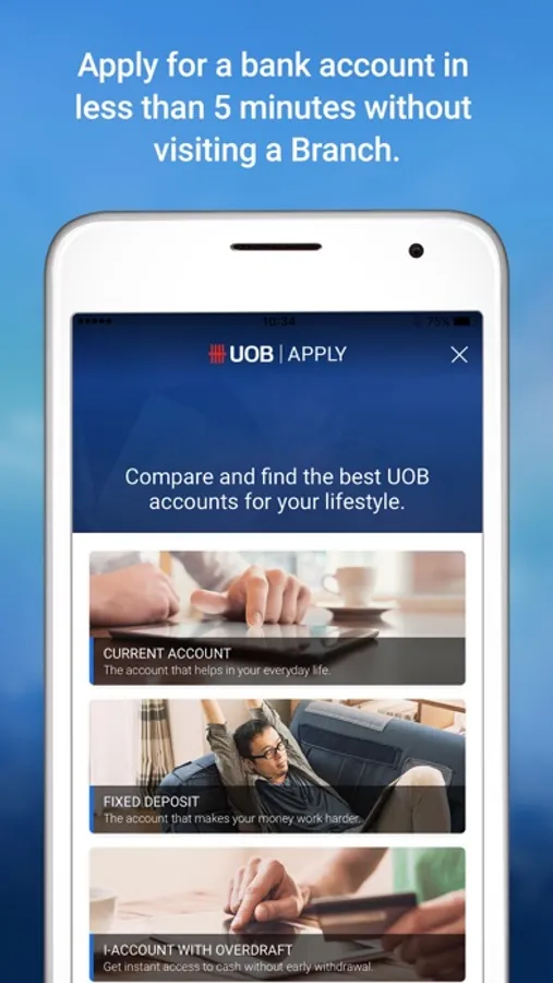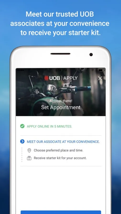 You no longer have to visit a branch to apply for an account or for your daily transactions. We put all these financial services together in one place on your mobile device to make your life easier. Complete your application within 5 minutes and choose a preferred place and time to meet our UOB associates at your convenience. Through the same app, you can instantly create a username and password with your ATM card information for your future banking needs.